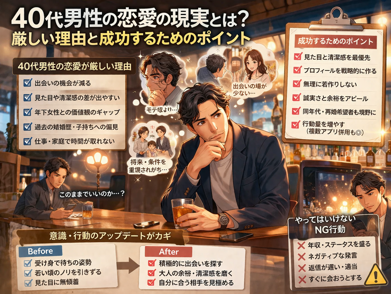 40代男性の恋愛は厳しいのか。出会いの減少や年齢フィルターなど現実的な課題を整理し、清潔感や安心感を武器にした成功のポイントを分かりやすく解説します。