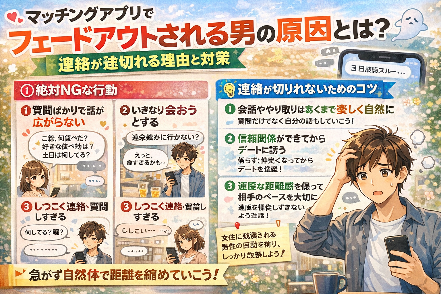 マッチングアプリでフェードアウトされると悩む男性へ。会話が続かない原因やタイミングの問題、他の男性との競争など理由を整理し、関係を続けるための対策を分かりやすく解説します。