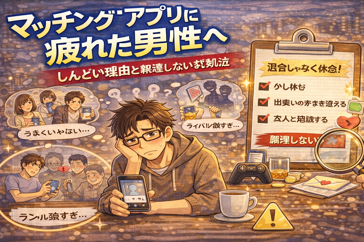 マッチングアプリに疲れたと感じる男性へ。メッセージの消耗や数字比較のストレスなど原因を整理し、無理せず続ける方法や休む判断基準、アプリ以外の出会い方を解説します。