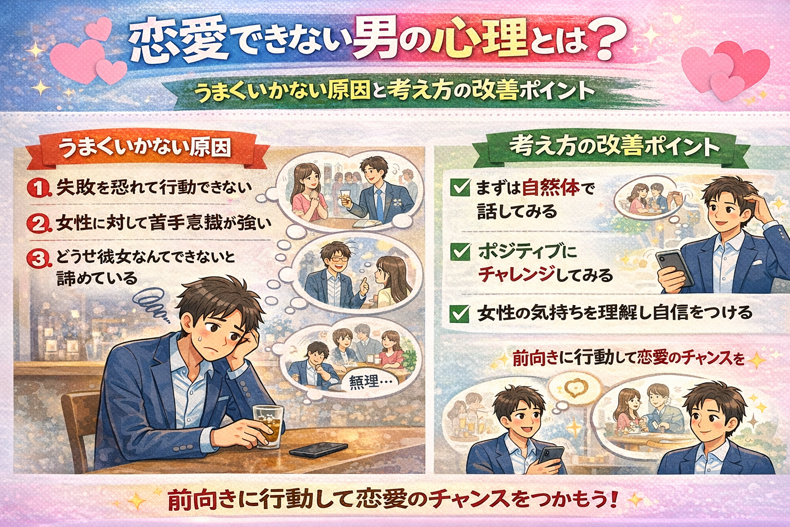 恋愛できない男性の心理を解説。自信のなさや失敗への恐れ、理想の高さなど原因を整理し、恋愛に踏み出すための考え方や改善ポイントを分かりやすく紹介します。