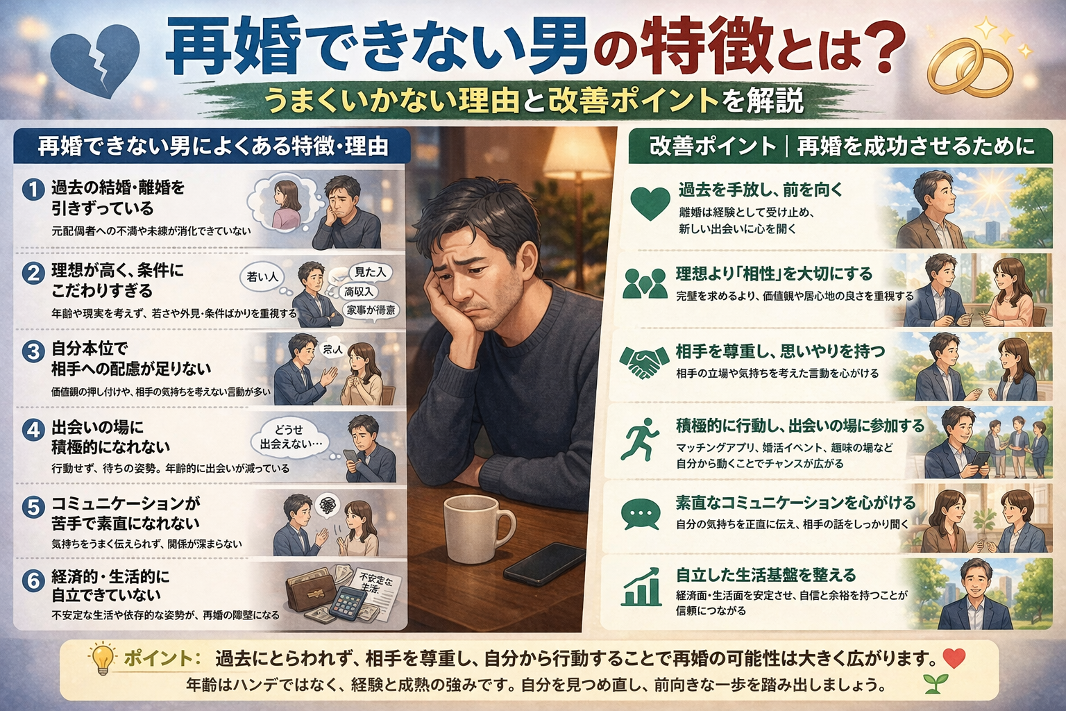 再婚できないと悩む男性へ。過去を引きずる心理や理想とのズレ、金銭面の不安などうまくいかない理由を整理し、再婚につなげるための改善ポイントを分かりやすく解説します。