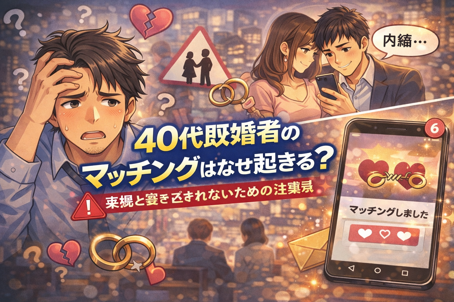 40代既婚者によるマッチングは実際に起きており、独身者が知らずに巻き込まれるリスクも高いのが現実です。本記事では既婚者マッチングが起きる背景や典型的なパターン、見抜くサイン、関わらないための現実的な対処法を解説します。