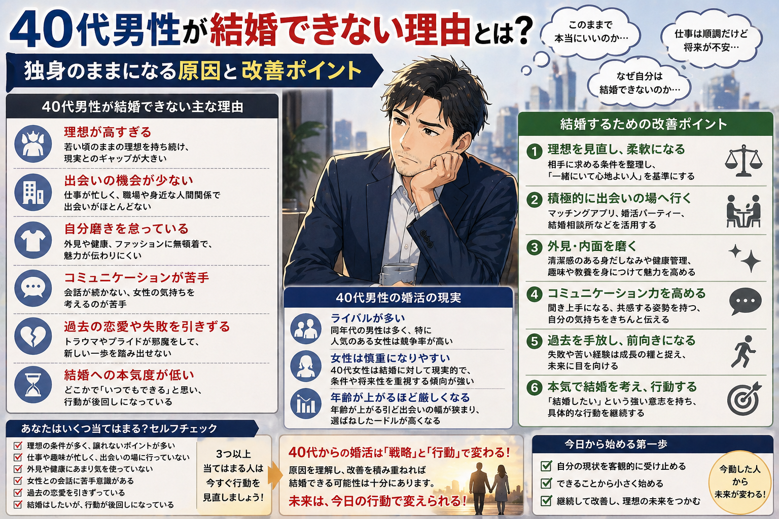 40代男性が結婚できない理由を解説。出会い不足や理想とのズレ、清潔感や行動不足など原因を整理し、独身から抜け出すための改善ポイントを分かりやすく紹介します。