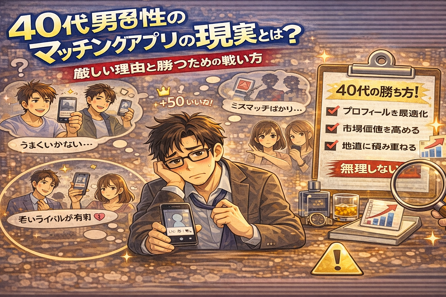 40代男性のマッチングアプリは厳しいのか。年齢フィルターや競争の現実、マッチ数が伸びにくい理由を整理し、安定感を武器にする具体的な戦い方を分かりやすく解説します。
