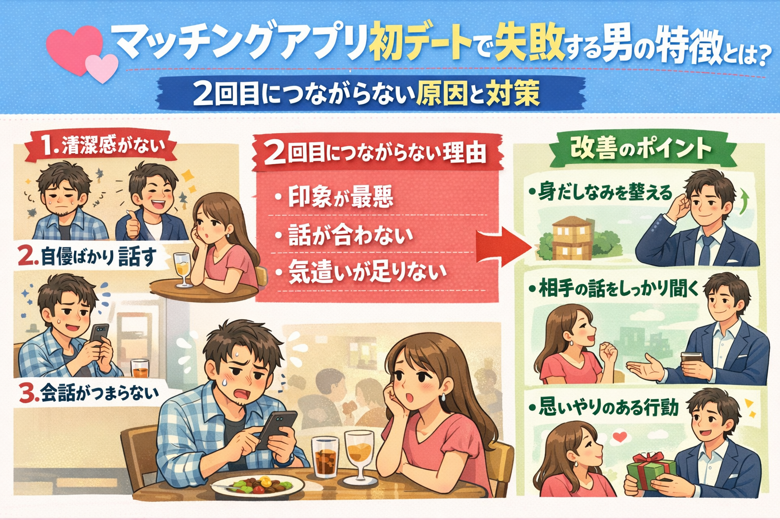 マッチングアプリの初デートで失敗する男性へ。清潔感や会話、距離感のミスなど2回目につながらない原因を整理し、好印象を与えるための具体的な対策を分かりやすく解説します。