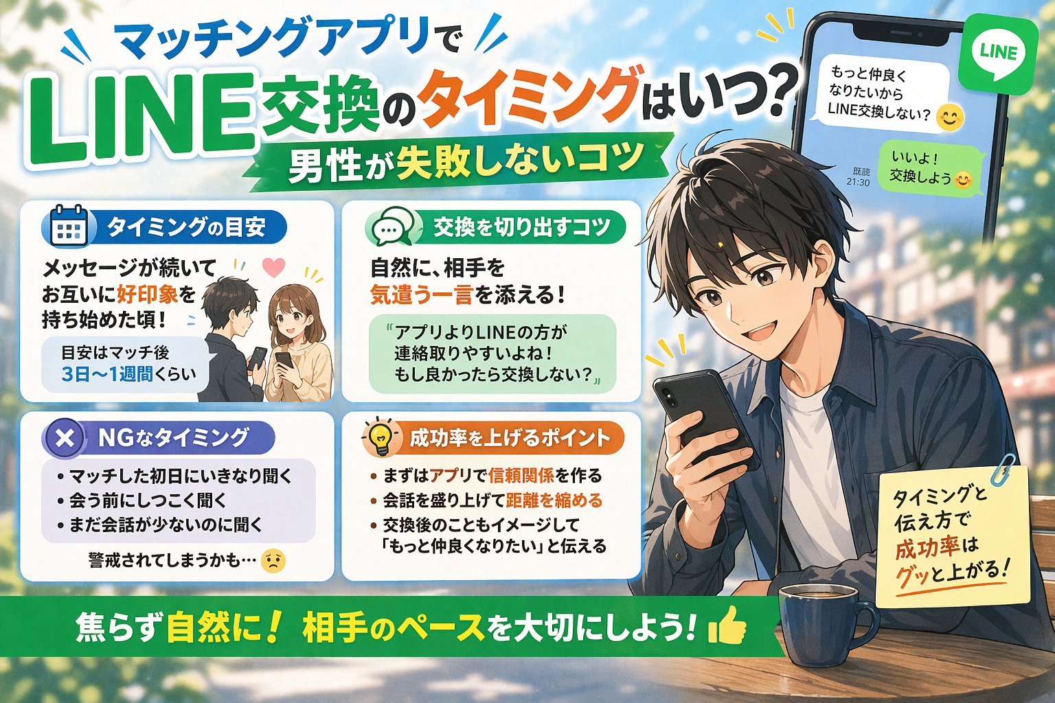 マッチングアプリでLINE交換のタイミングに悩む男性へ。早すぎ・遅すぎの失敗例や成功しやすい目安、自然な誘い方のコツを分かりやすく解説します。