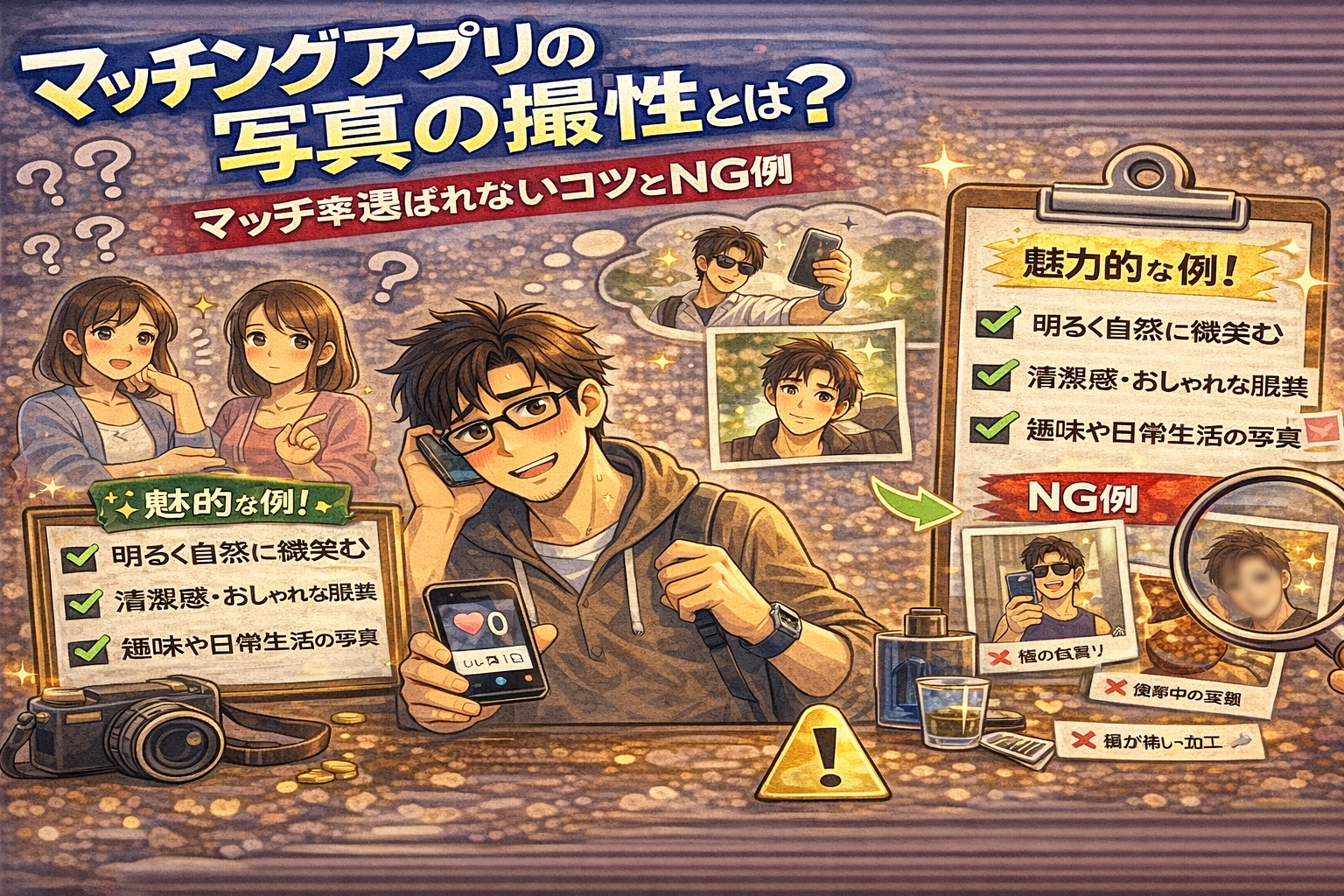 マッチングアプリで男性の写真は第一印象を決める重要ポイント。好印象を与える写真の撮り方や清潔感の出し方、自然な笑顔の作り方、避けるべきNG写真まで分かりやすく解説します。